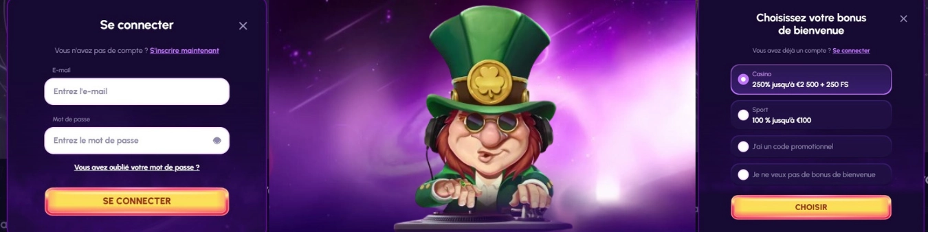 - Effectuez votre premier dépôt en choisissant une méthode de paiement sécurisée, puis profitez immédiatement de votre bonus de bienvenue (jusqu’à 2500 € + 250 tours gratuits).